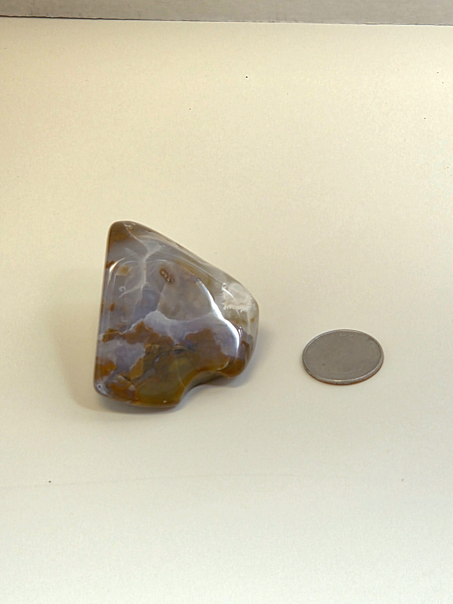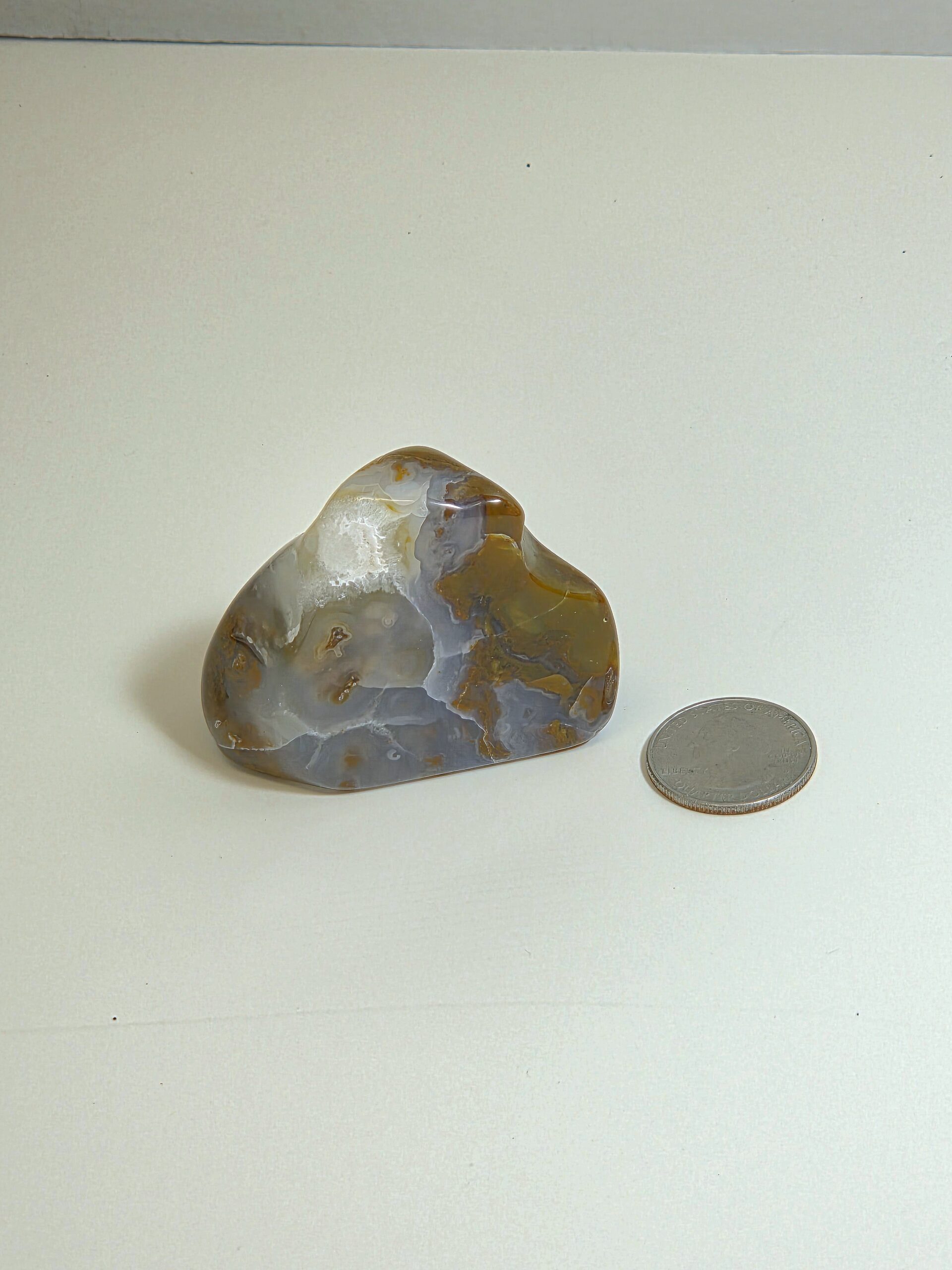 Stones measure 3-5 inches around, depending on the individual piece. They have either a cut and polished or naturally flat base, allowing them to rest one desk, shelves, or tables.