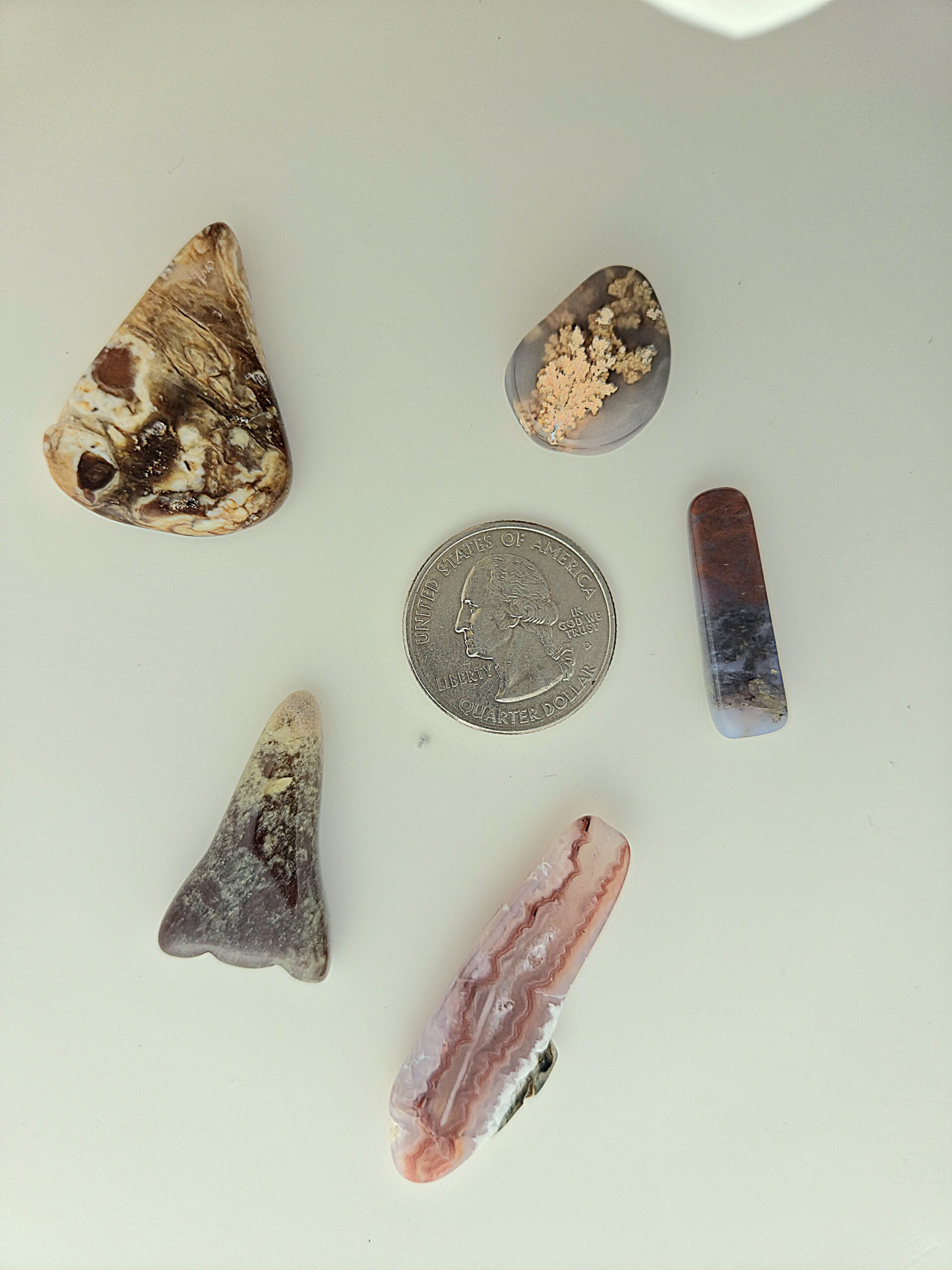 A collection of Idaho’s natural artistry, hand-shaped and polished to showcase natural beauty. Each 5-pack of cabochons features a mix of agate, jasper, and petrified wood. All are stones I personally collected from the mountains of central Idaho and polished to a mirror finish.