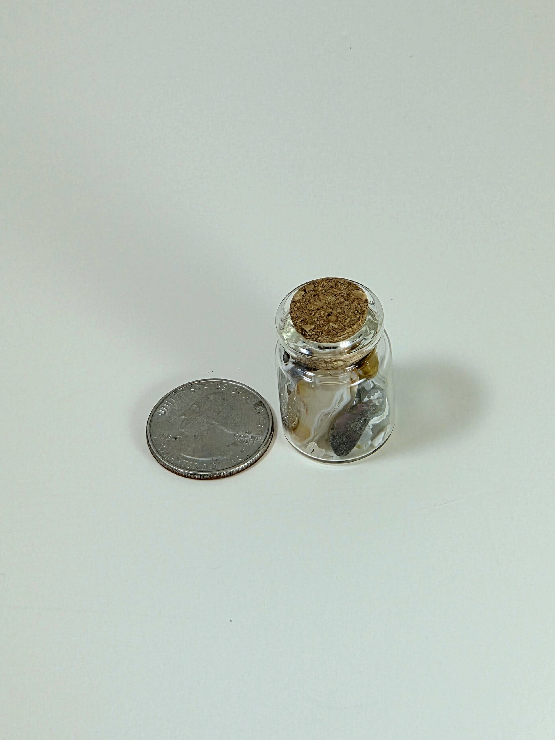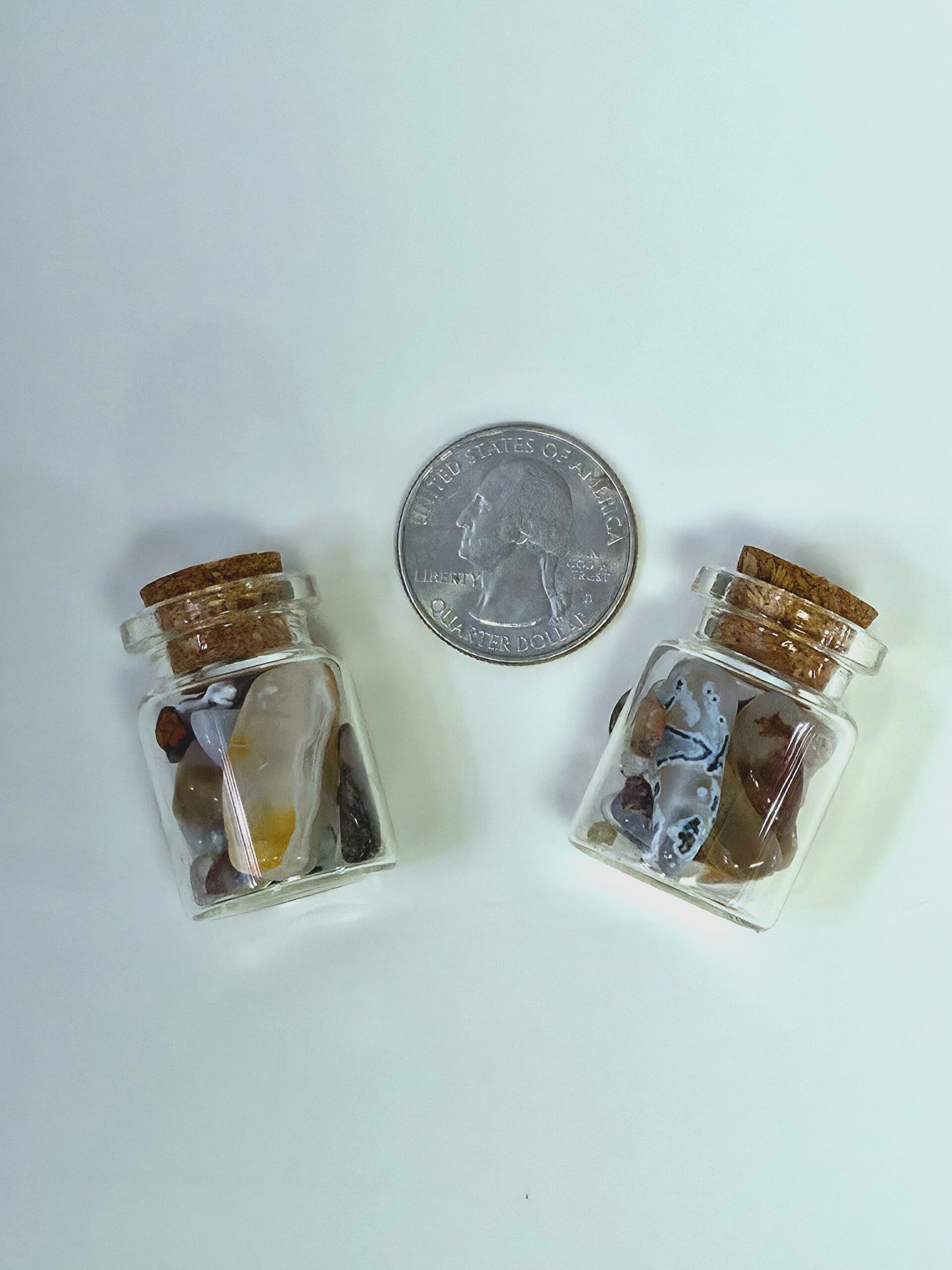 A little bit of Idaho’s wilderness in a bottle. Each mini cork jar holds a mix of tiny, polished agates, jaspers, and petrified wood collected in the mountains of central Idaho.
